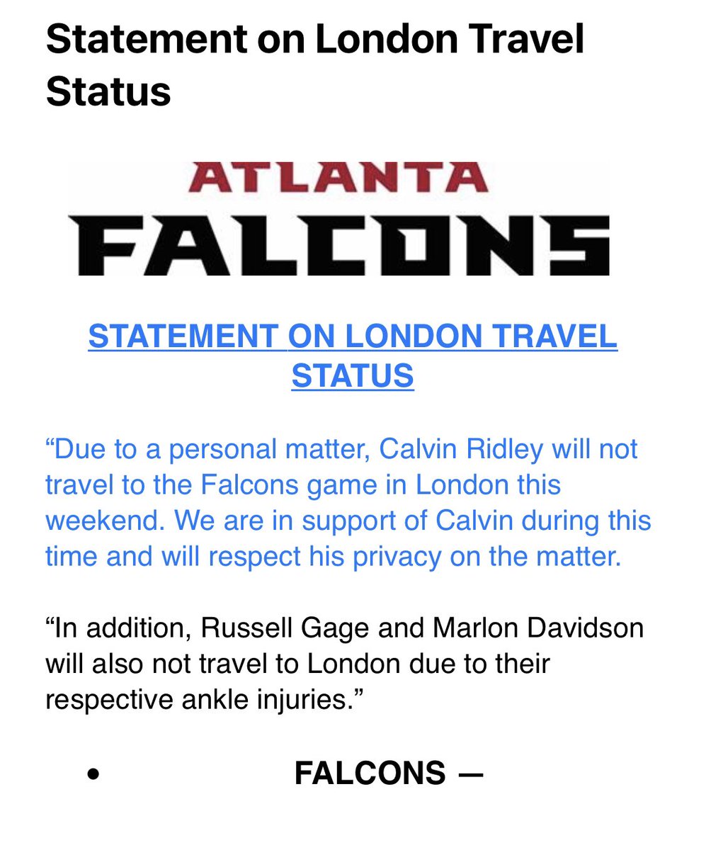2 days agoFalcons WR Calvin Ridley is not making the trip to London due to a personal matter and he is out for Sundays game against the Jets. Russell Gage and Marlon Davidson will be sidelined for Week 5s game as well. We are not sure why Ridley is not traveling to London as the only cause given is a personal matter.